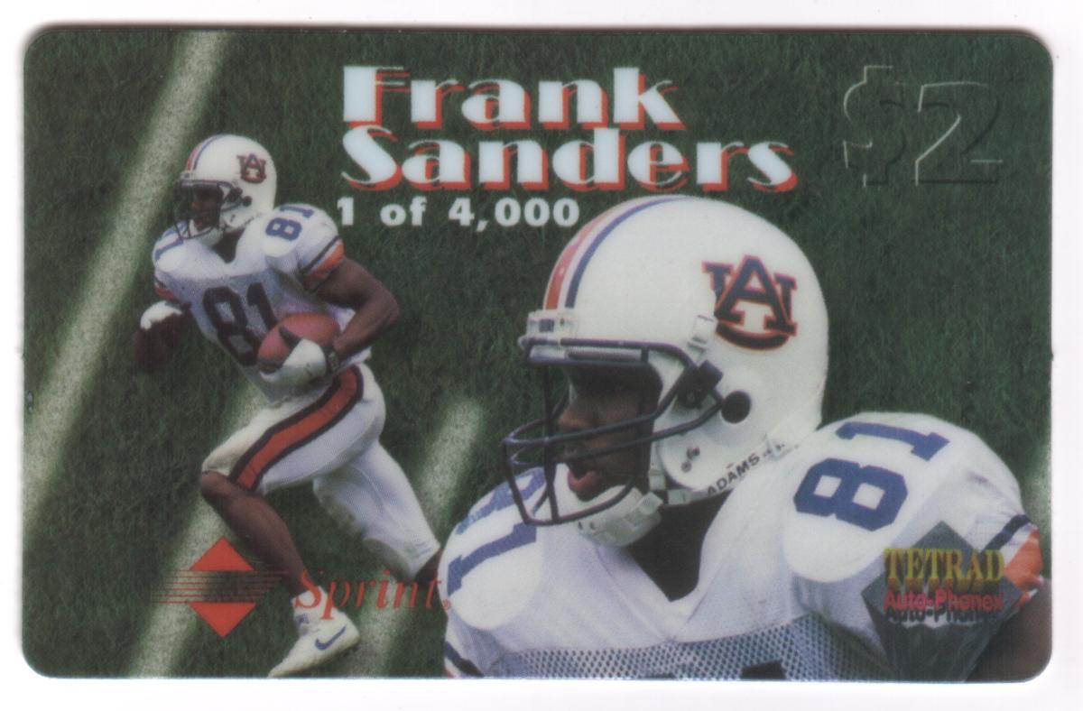 This collectible chip card features Frank Sanders, an American football player, wearing a black football uniform with the number 62 displayed on his jersey. The image shows Frank Sanders running on the field during a game, holding a football securely in his right arm with his left arm extended, appearing to be in motion. The football uniform includes a helmet with faceguard and black pants with white stripes on the sides. The background shows a blurred football stadium with green grass and a crowd.