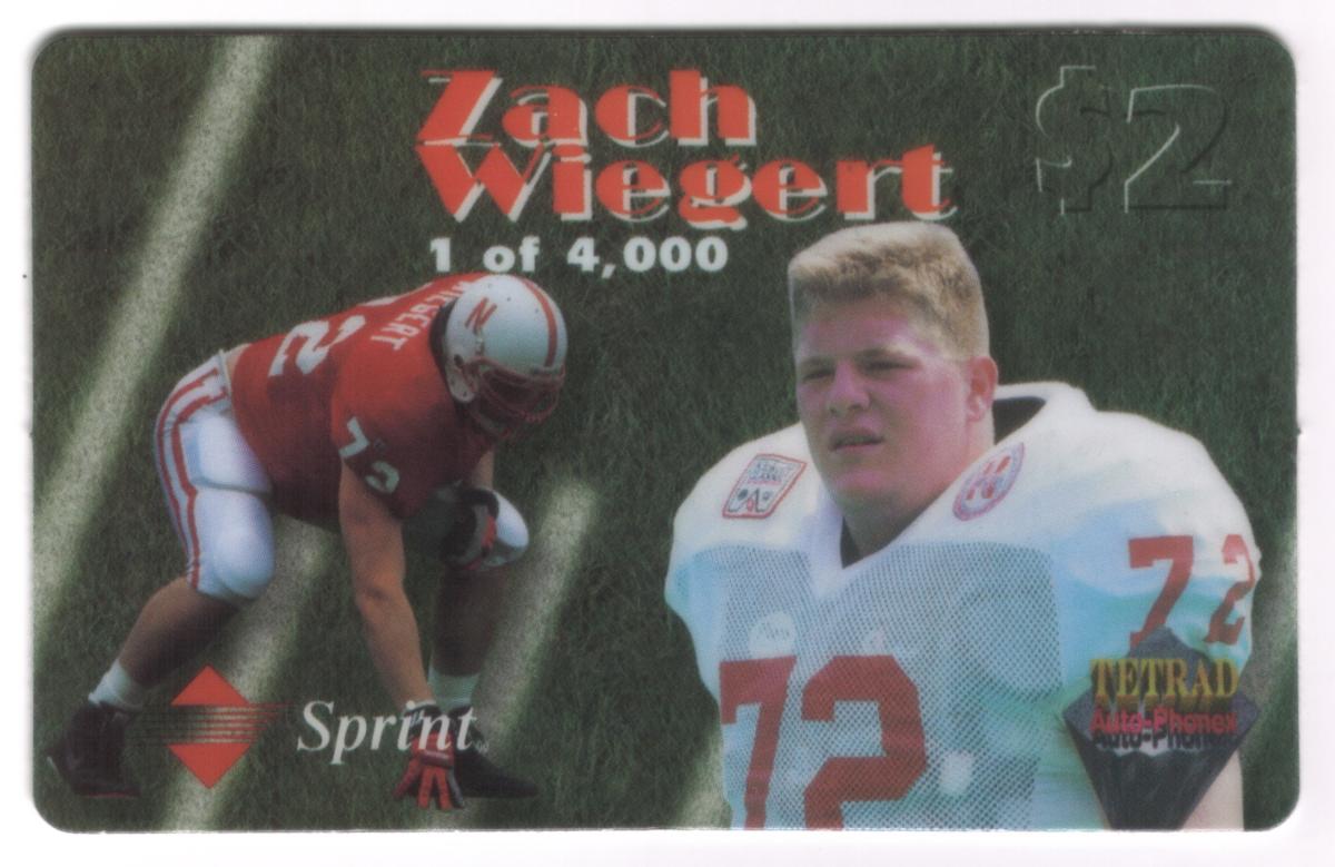This collectible phone card features an image of Zach Wiegert, a professional football player known for wearing number 69. Zach Wiegert is depicted in his football uniform on the card, which includes his helmet, shoulder pads, and jersey. The photograph captures him during action, set against a plain background that emphasizes the player. The card is branded as an Auto-Phonex Tetrad Football collectible, highlighting its connection to sports, specifically football. The denomination of the card is $2, clearly printed on the front.