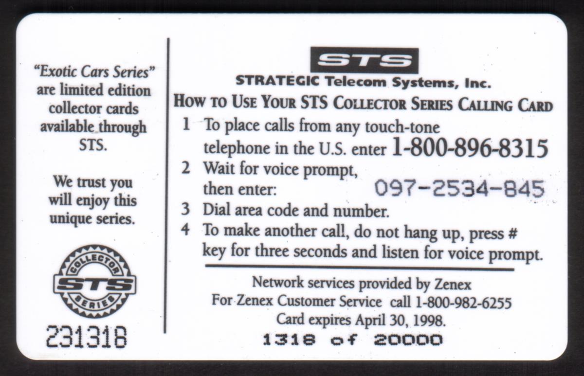 Keywords associated with this collectible card are: SKU-31543, zenex, classic automobiles, classic cars, transportation, Exotic Cars: Lotus Esprit USED, Strategic Telecom Sys.