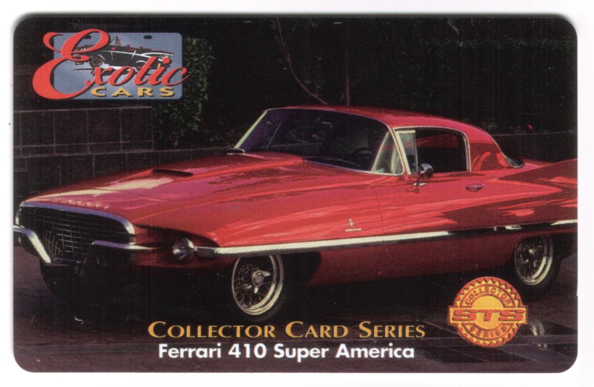 This collectible phone card from the Exotic Cars series features a striking image of the Ferrari 410 Super America. The car is presented in bright red, showcasing its sleek, classic design with smooth curves and a distinctive grille at the front. The vehicle's chrome accents and wire-spoke wheels are clearly visible, emphasizing its elegance and vintage appeal.
