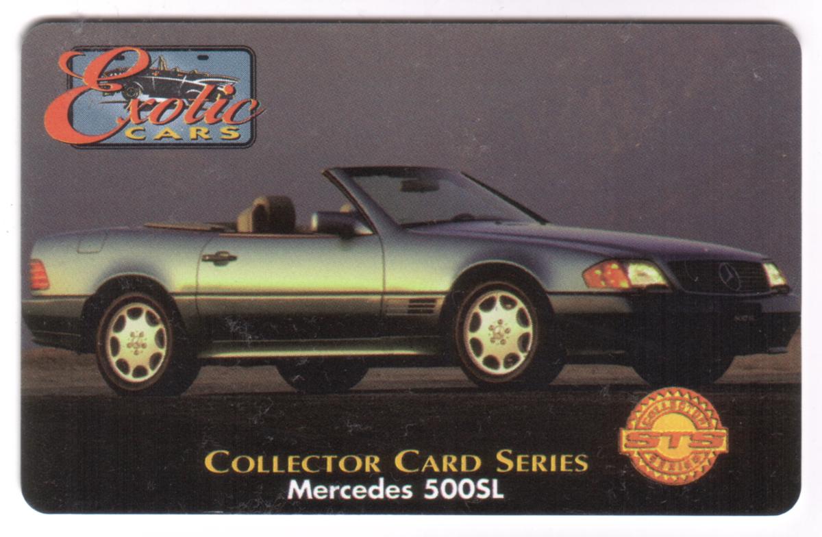 This card is a part of a series dedicated to classic automobiles and exotic transportation, specifically showcasing the Mercedes 500SL model. The Mercedes 500SL is a well-known luxury sports convertible, noted for its performance and refined style, making this card a notable collectible for enthusiasts of classic cars and automotive history.