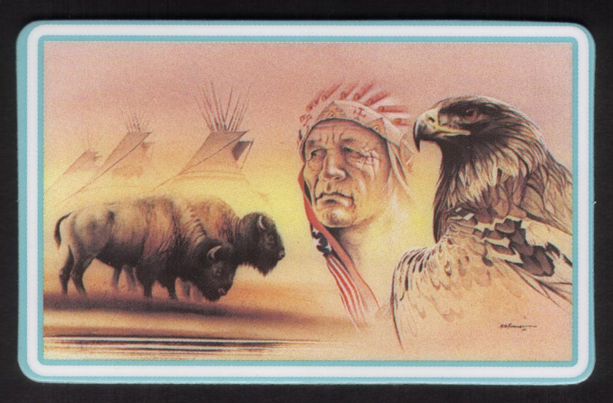 This collectible card features artwork by M S Franco, showcasing iconic imagery representing the American Southwest and Native American culture. On the left side are two bison standing near traditional teepees, rendered in warm earth tones that convey the natural environment of the region. The center of the card displays a solemn Native American elder wearing a feathered headdress, highlighting themes of heritage and respect.