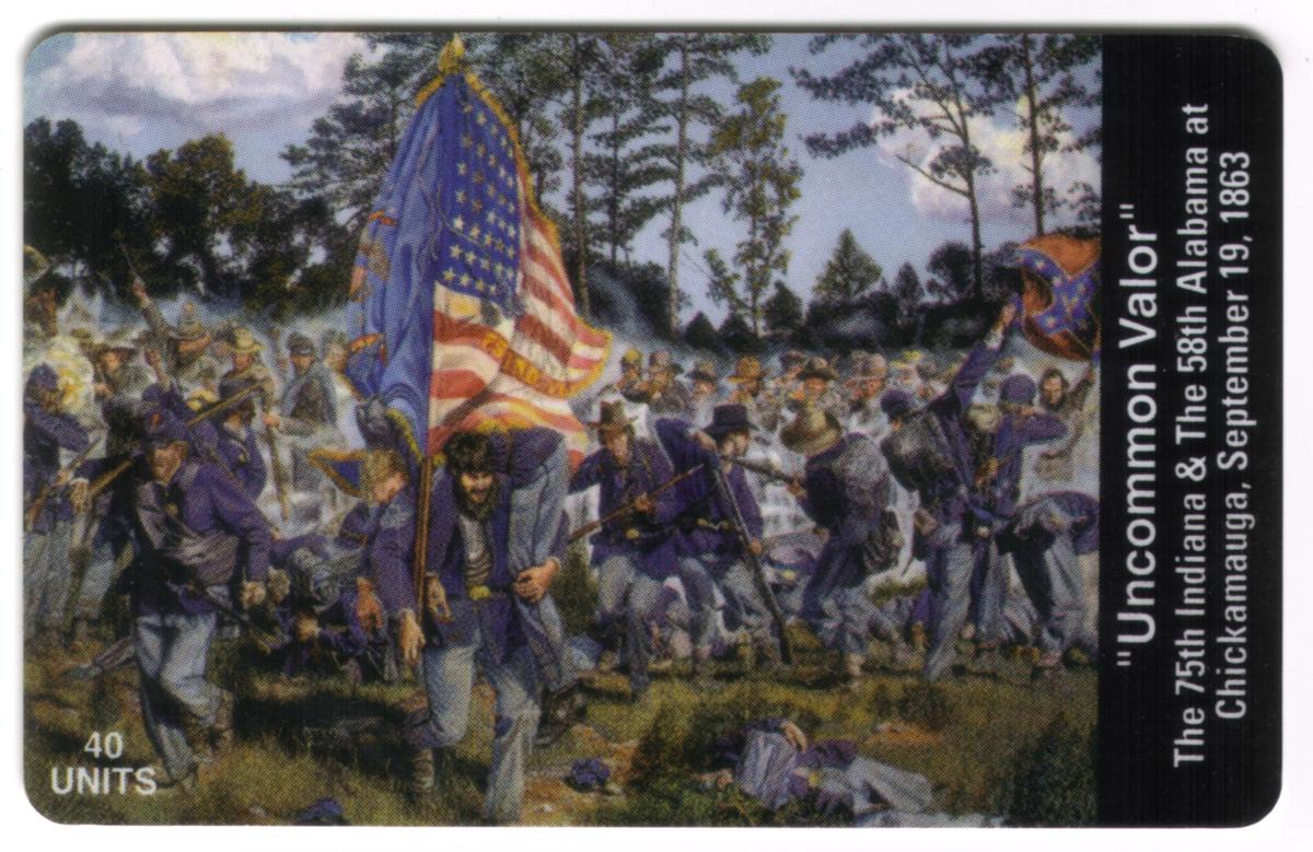 On the right side of the card, the title "Uncommon Valor" is displayed vertically alongside the text "The 75th Indiana & The 58th Alabama at Chickamauga September 19, 1863." The card indicates a value of 40 units in the bottom left corner, aligning with its use as a collectible phone card. The piece is credited to Bayliss Creative.