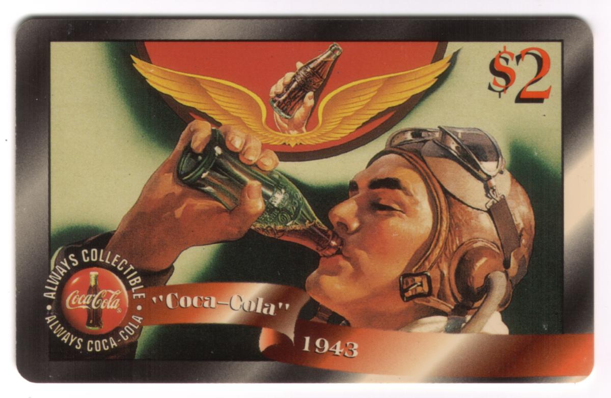 This collectible Coca-Cola phone card features a detailed vintage illustration of a World War II pilot from 1943, drinking from a classic glass Coca-Cola bottle. The pilot is depicted wearing an aviator helmet and goggles, with his face turned slightly upward as he enjoys the beverage. Above the pilot’s head is a winged emblem with a fist clutching a shattered triangle, symbolizing military or aviation themes.