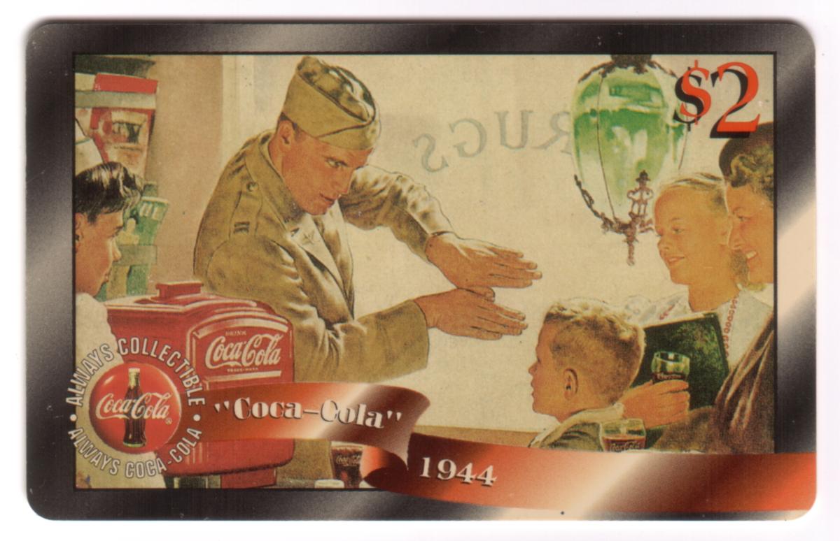 In the foreground, on the left side, there is a bright red Coca-Cola cooler with visible Coca-Cola logos. The text “Coca-Cola” and the year “1944” are displayed prominently on a ribbon-like banner at the bottom center of the card. A circular Coca-Cola logo with the phrase “Always Coca-Cola” appears on the cooler. The card denomination is shown as $2 in the top right corner.