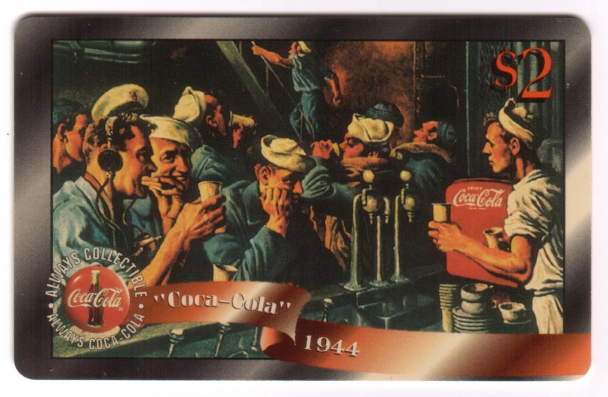 This collectible phone card features a 1944 Coca-Cola themed illustration depicting World War II sailors enjoying Coca-Cola beverages. The scene shows several sailors in uniform gathered around a soda fountain, some holding glasses filled with Coca-Cola. One sailor in white is serving drinks from a Coca-Cola cooler, prominently displaying the bright red Coca-Cola logo. The atmosphere captures camaraderie and refreshment during wartime.