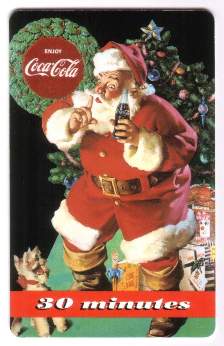 To the left of Santa Claus, there is a green wreath with a red circular center displaying the white Coca-Cola logo and the word "ENJOY" above it. At the bottom of the card, a red band includes the text "30 minutes" in white, indicating the card's usage time. In the lower left corner, a small dog looks upward towards Santa, and various wrapped Christmas gifts are arranged beneath the tree.