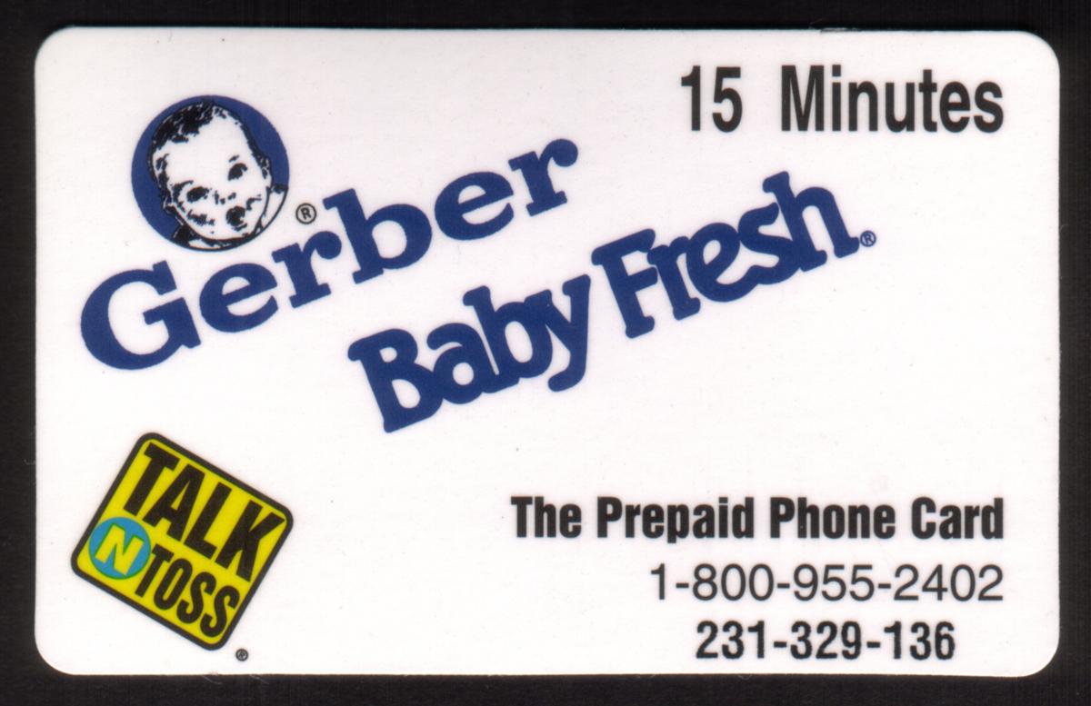 This 1994 promotional phone card is part of the "Gerber & Baby Fresh Promo Talk 'N Toss" series distributed by Bottom Line Tech. The card is clearly intended for prepaid telecommunications use and highlights the Gerber Baby Fresh brand along with the promotional Talk 'N Toss product feature.