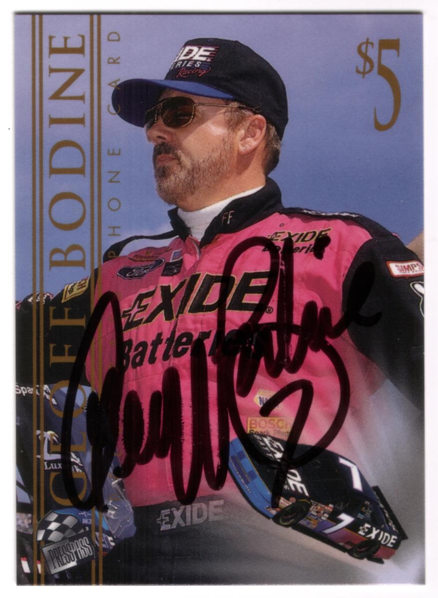 The left side of the card displays the name "Geoff Bodine" in gold vertical text along with the words "Phone Card" underneath it. The bottom left corner of the card features a NASCAR Sprint Cup Series logo, and an image of Bodine's black and pink Exide racecar is positioned at the lower middle area.