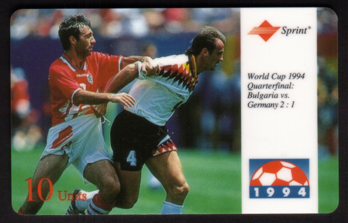 This collectible Sprint phone card features a color action photograph from the 1994 FIFA World Cup quarterfinal match between Bulgaria and Germany. In the image, a Bulgarian player dressed in a red jersey and white shorts is engaged in close physical play with a German player wearing a white jersey with a distinct black, red, and yellow geometric pattern on the shoulders and black shorts. The German player’s shorts display the number 4.