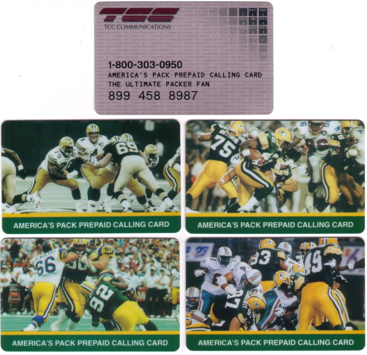 This set contains five prepaid calling cards from TCC Communications, all centered on the Green Bay Packers, the NFL team based in Green Bay, Wisconsin, USA. The cards are part of the "America's Pack Prepaid Calling Card" series and celebrate the sport of football, specifically for dedicated Packers fans. The calling cards feature photographic action shots from Green Bay Packers football games, highlighting players in various plays on the field.
