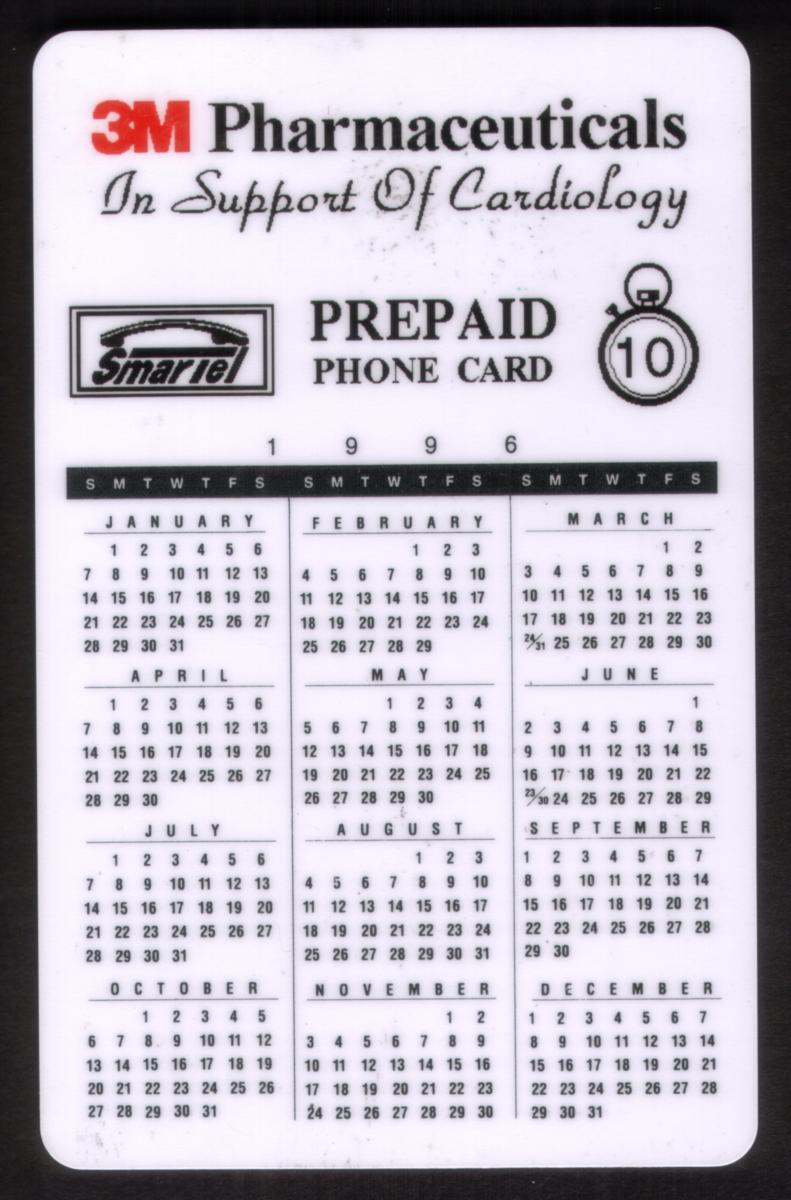 This collectible 10-minute phone card was issued by 3M Pharmaceuticals in support of cardiology in 1996. The card features the logos of 3M Pharmaceuticals and SmarTel Communication prominently on the front. The text on the card clearly states "10 Minute" indicating the card’s calling time value. The card is marked as promotional and medical-related, highlighting its connection to the pharmaceutical industry and cardiology support efforts.
