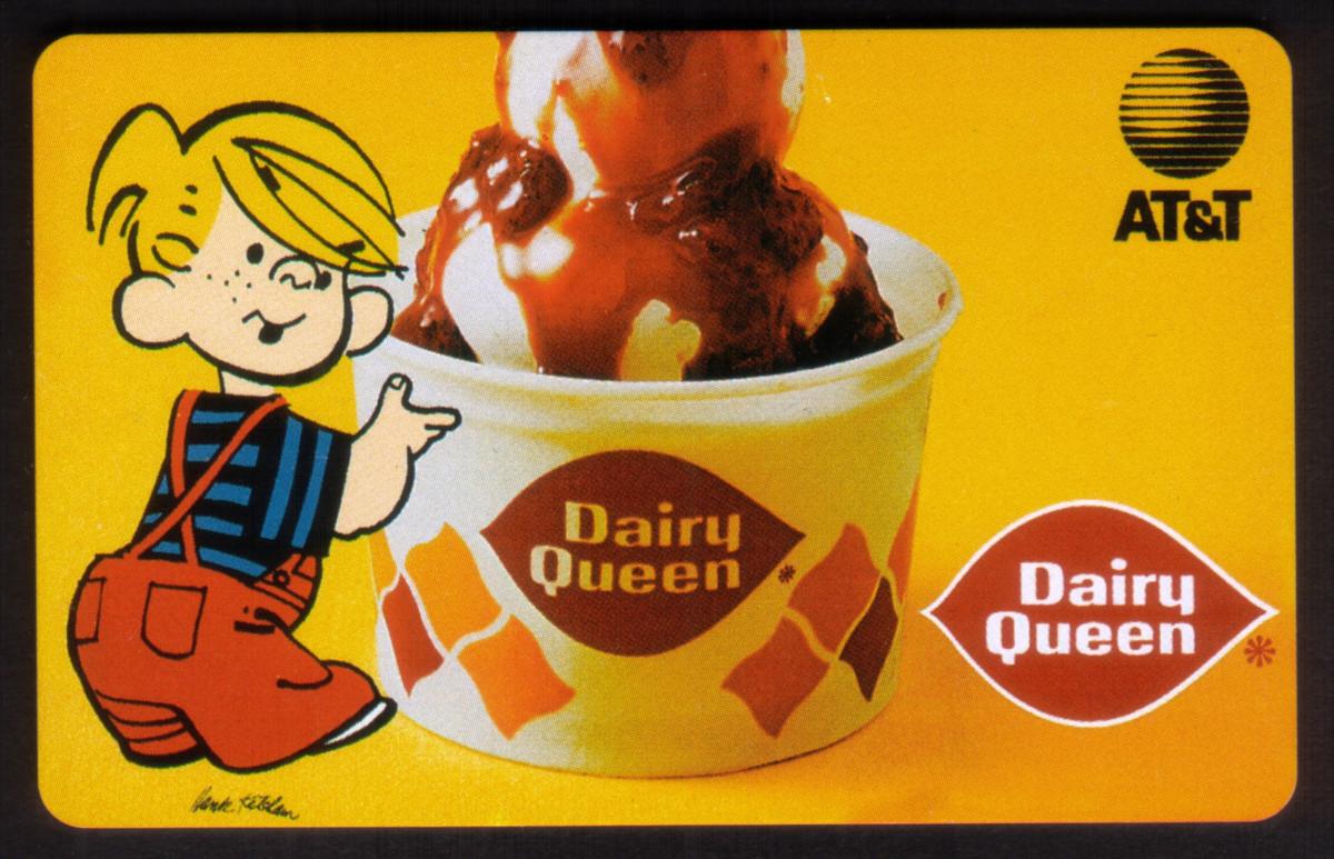 This card is a promotional collectible combining the Dairy Queen brand with Dennis The Menace artwork, issued by AT&T. It showcases a classic American pop culture collaboration between a popular comic strip character and a well-known fast food ice cream chain, making it a unique piece for phone card collectors.