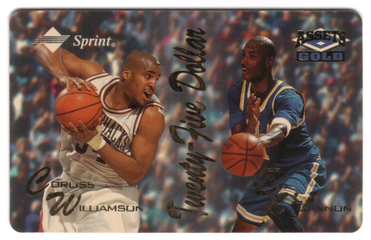 The card displays the Sprint logo in the top left corner and the "Assets Gold" logo in the top right corner. The text “Twenty-Five Dollars” runs vertically along the right center of the card, indicating the card’s value. Below the players' images, their names “Corliss Williamson” and “Ed O’Bannon” are printed in script-style font.