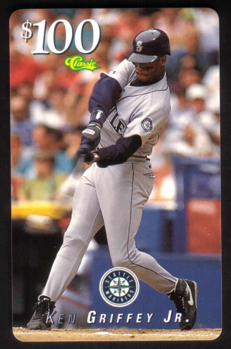 The card is valued at $100, prominently displayed in the upper left corner in white numbers. Below the value, there is a small green and yellow Classic logo. Centered near the bottom is the Seattle Mariners' official team emblem with the words “Ken Griffey Jr.” printed underneath in all capital letters, clearly identifying the player. The image showcases Ken Griffey Jr.'s role as a batter, reflecting his status as one of baseball’s Most Valuable Players (MVPs) during his time.