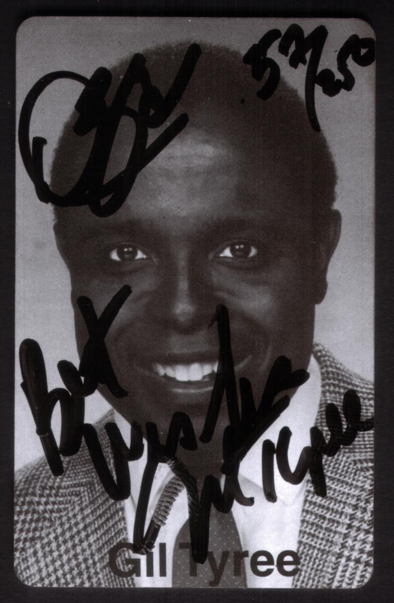 This collectible phone card features Gil Tyree, a well-known Arizona TV sportscaster, with his original autograph prominently displayed on the card. The design includes the logos for Valley TV and Dynamic Technologies, indicating the card's promotional and giveaway status associated with Arizona media. The artwork highlights Gil Tyree for his prominence in sports broadcasting within Arizona, creating a distinct collectible for fans of local sports media.