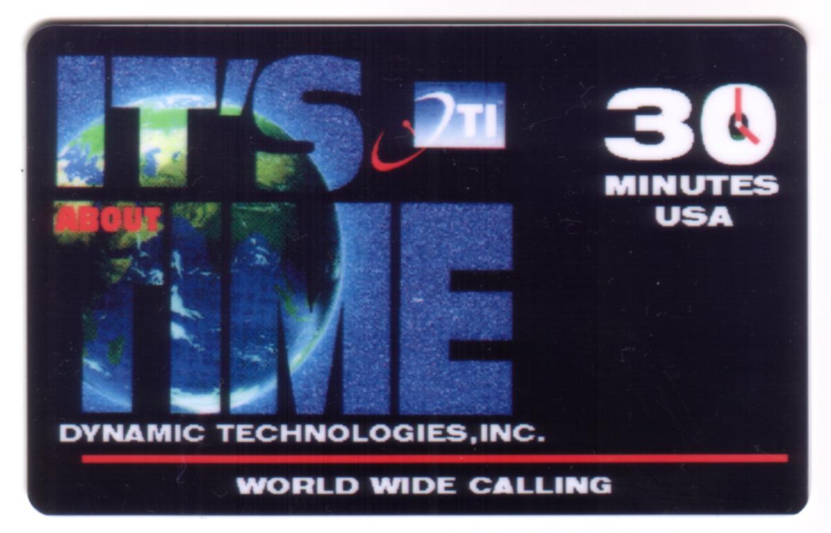 This collectible utility card has a 30-minute usage value and is branded with the name "It's About Time." It features a design focused on world-wide calling services provided by Dynamic Technologies. The card displays the "WorldCom" logo in combination with "Dynamic Technologies," emphasizing global communication capabilities. The main visual elements include the phrases "It's About Time" and "World Wide Calling," both rendered prominently on the card’s surface.