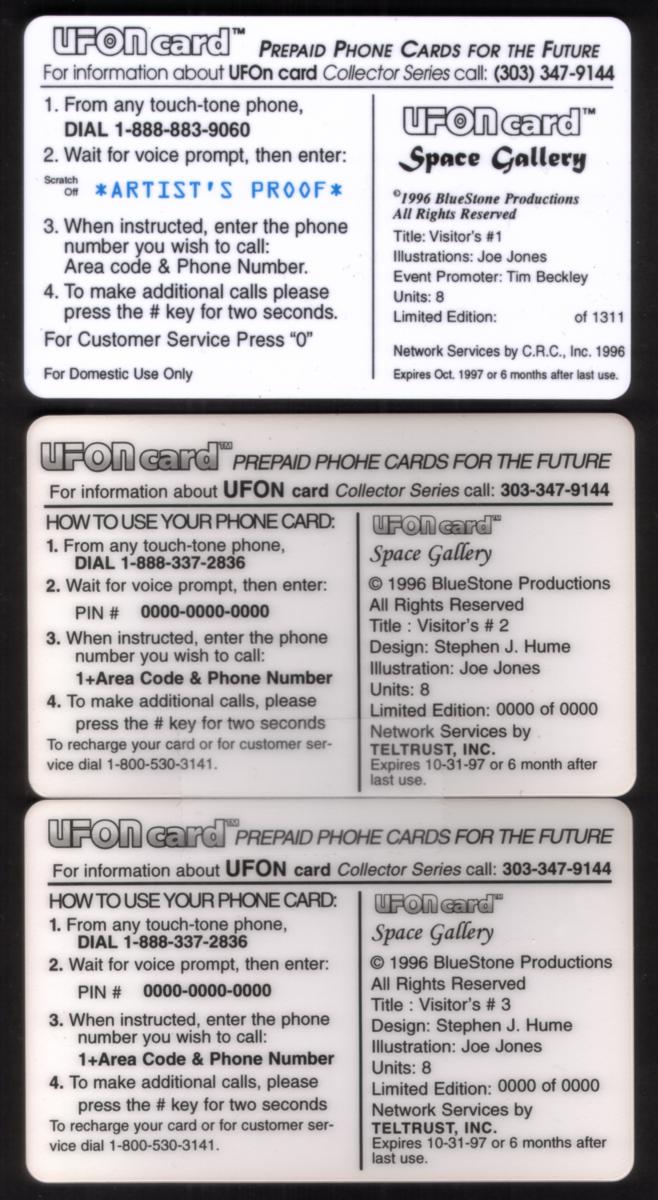 These three collectible phone cards are from the Enigma Con '96 UFO and New Age Expo series associated with Denver, Colorado; Palm Springs, California; and Phoenix, Arizona. Each card features a detailed artistic design by Steve Neill, showcasing extraterrestrial and UFO themes connected to the event locations.