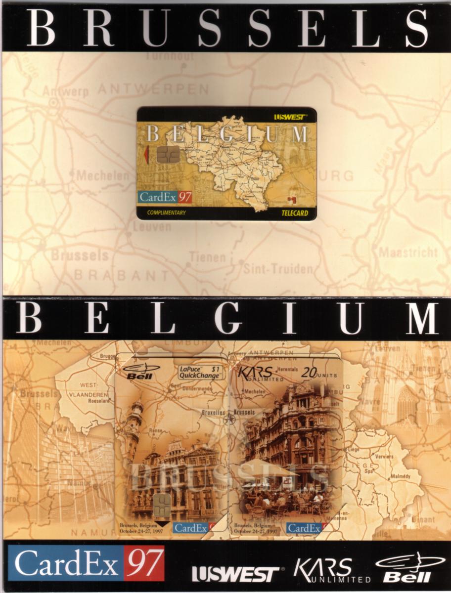 A 1997 Belgium CardEx promotional piece featuring Brussels landmarks, a vintage map backdrop, and embedded microchip, celebrating telecom innovation. |
