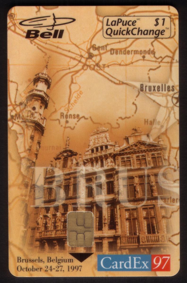 The third card in the set carries a Bell logo at the upper left alongside “LaPuce QuickChange $1” inside a white rounded rectangle, indicating a stored value of one dollar. The photographic image focuses on historical Brussels buildings with intricate façades and architectural details, again placed over a muted map background. The CardEx ’97 logo, the event’s date, and location are printed near the bottom. These cards collectively commemorate CardEx 1997 in Belgium and feature telecommunications companies USWest and Bell as part of the promotional collaboration.