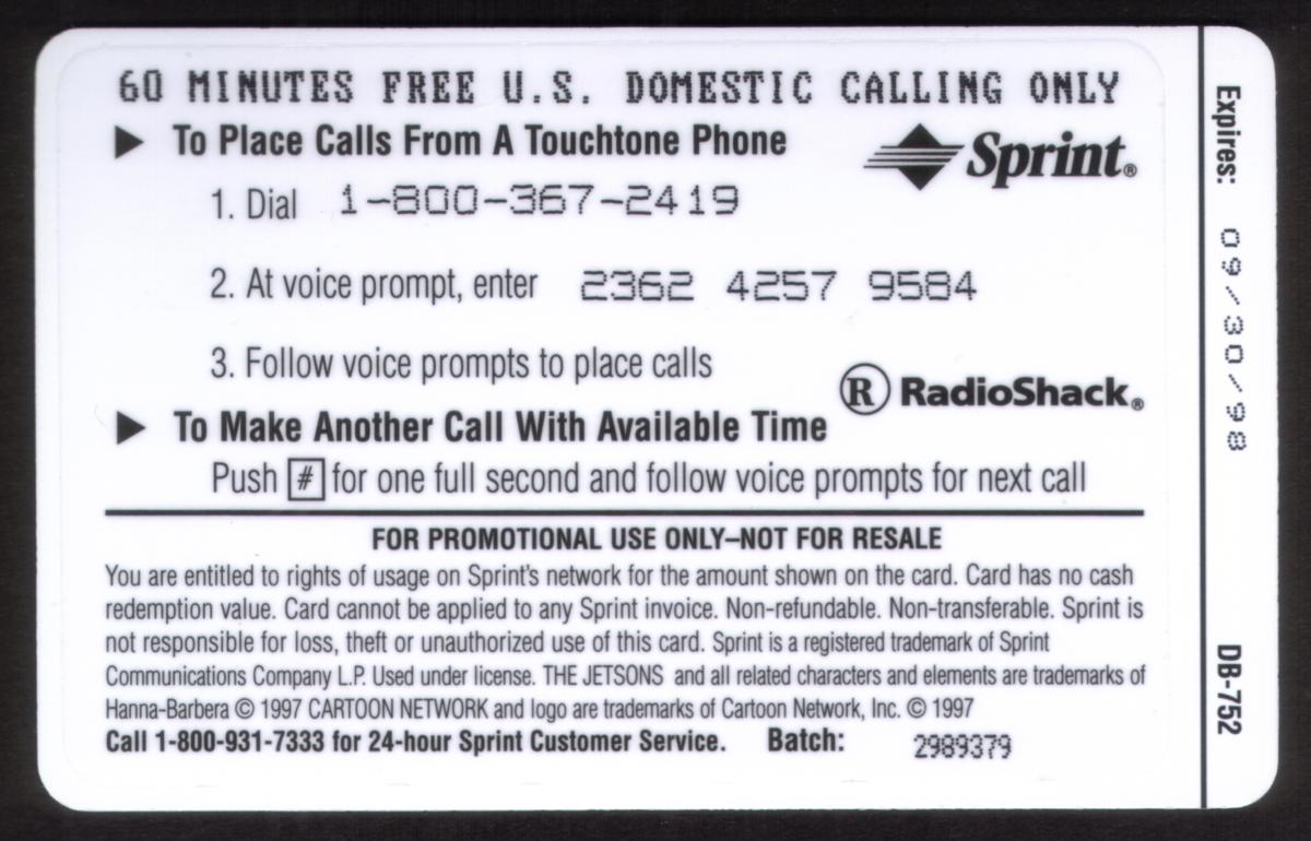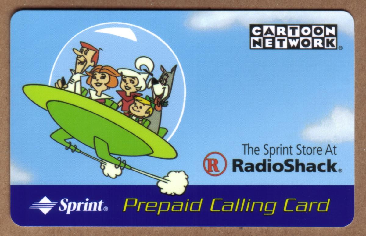 This card highlights elements from the futuristic animated series The Jetsons, well-known for its space age setting and iconic family characters. It is a prepaid calling card issued by Sprint and promoted through RadioShack, combining popular culture with telecommunications.