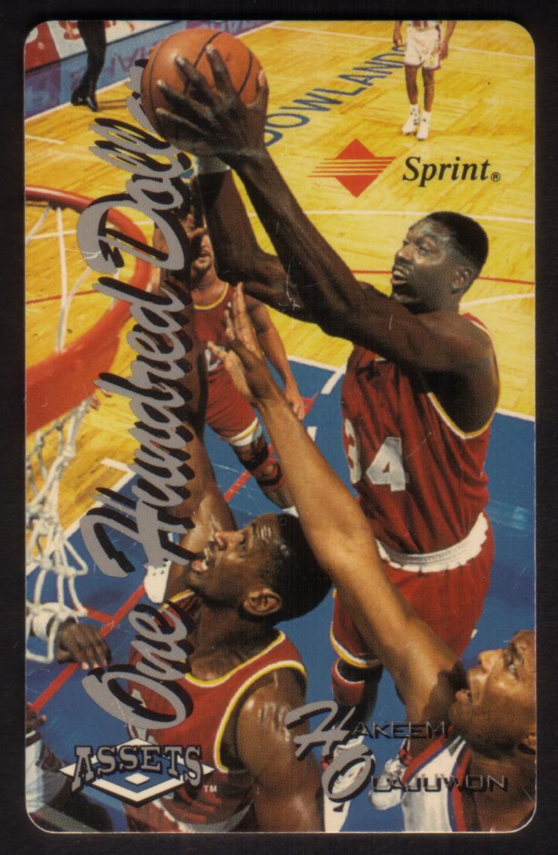 The card includes several textual elements: "One Handed Dunk" is written diagonally across the left side in stylized font, and the word "Assets" appears near the bottom left corner. The name "Hakeem Olajuwon" is printed near the bottom right, with "HAKEEM" in uppercase block letters and "Olajuwon" in a script style underneath. The "Sprint" corporate logo in red and black is positioned near the upper right corner.