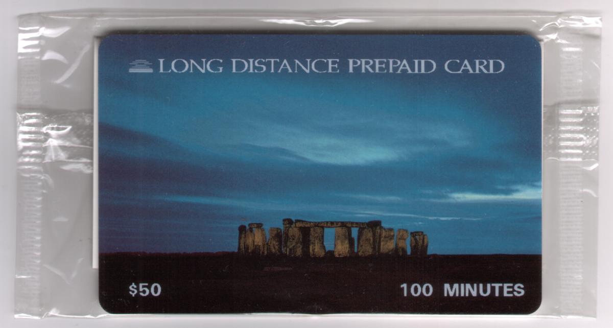 At the top center of the card, the text "LONG DISTANCE PREPAID CARD" is printed in white uppercase letters. The bottom left corner of the card shows the denomination "$50," while the bottom right corner states "100 MINUTES," indicating the prepaid usage available. This card is associated with British sights and historical landmarks, capturing Stonehenge as a key British icon of ancient history and monuments.