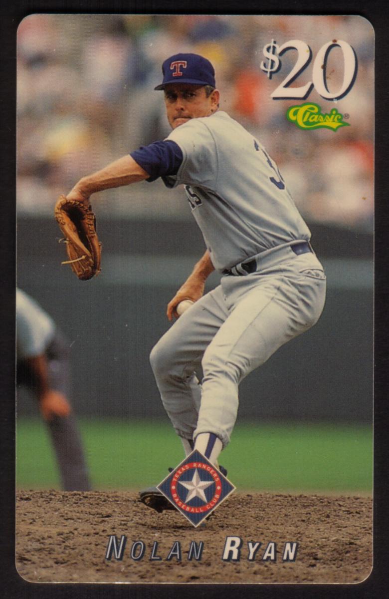 This collectible card features baseball legend Nolan Ryan in the midst of his pitching motion wearing the Texas Rangers uniform. Ryan is dressed in a classic light gray uniform with blue accents, and the "T" emblem is clearly visible on his blue cap. The card has a $20 denomination displayed in the top right corner along with a green "Classic" logo beneath the value.