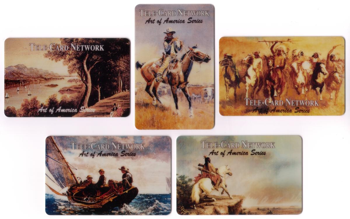 These collectible phone cards are part of the "Art of America Series" issued by Tele-Card Network (TCN) under WorldCom. Each card features a unique artistic scene depicting aspects of American culture, history, and landscape, emphasizing themes such as Americana, Native American heritage, sailing, cowboys, horses, and rivers.