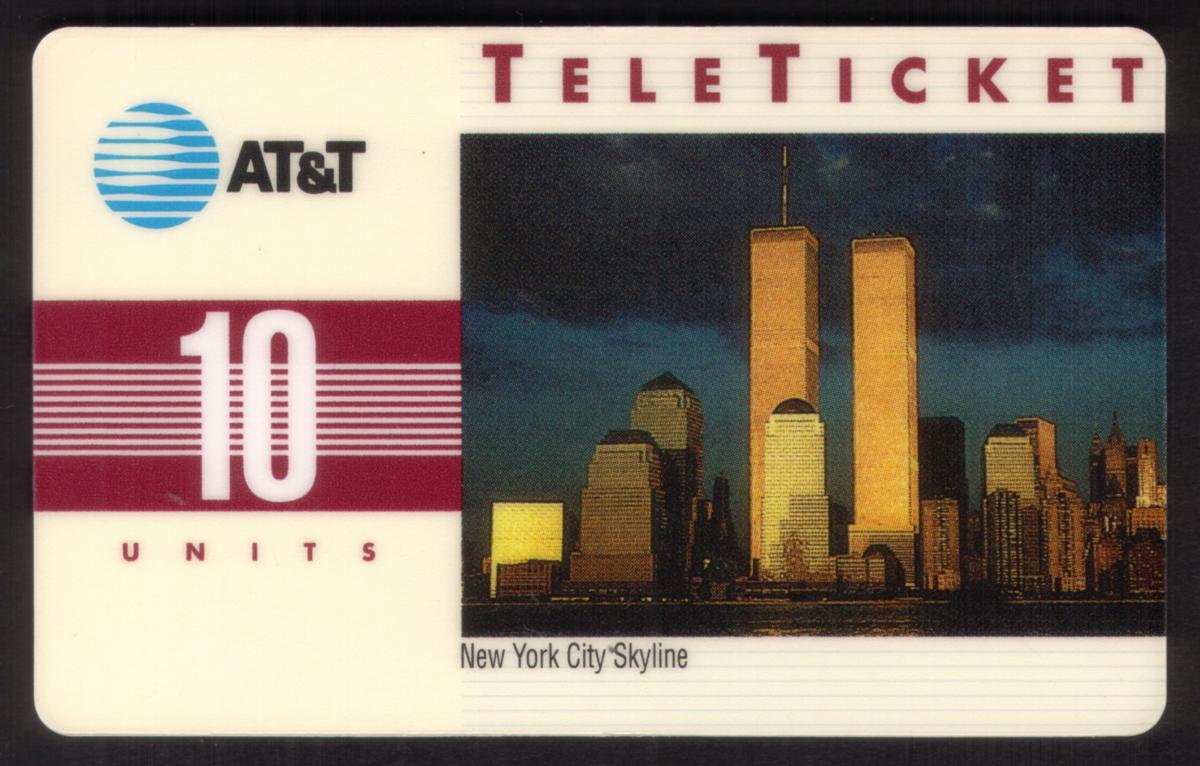 This AT&T Teleticket collectible phone card features a photographic image of the New York City skyline prominently showcasing the World Trade Center Twin Towers. The skyline is depicted during the evening with the buildings illuminated against a darkening sky. Other notable skyscrapers surround the Twin Towers, creating a distinctive and iconic cityscape view.