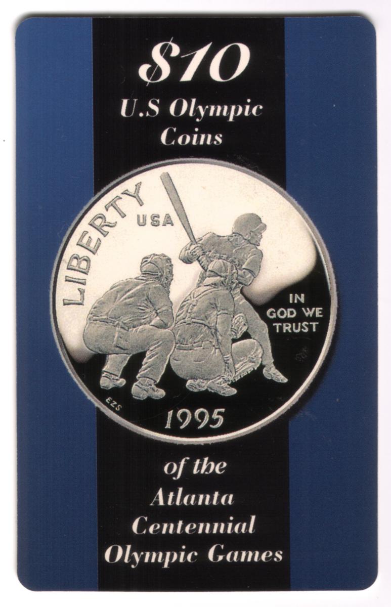 This collectible item is a Telecoin Card issued by New Media Telecom International (NMTI) in 1995, commemorating the Atlanta Centennial Olympic Games. The card features an image of a baseball-themed design modeled after a $10 U.S. Olympic coin. The coin displays the inscriptions "LIBERTY," "USA," "IN GOD WE TRUST," and the year "1995." The coin design depicts a baseball batter and catcher in detailed relief, with the batter poised to swing at an incoming pitch.