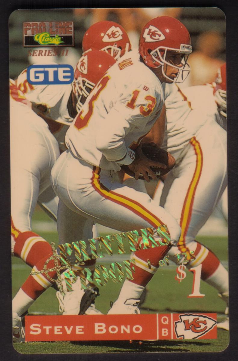 The card’s front displays Steve Bono in action, emphasizing the sport of football. Team logos and official NFL insignia highlight its authenticity and official licensing. The design style and layout correspond to trading cards focused on professional football players, specifically quarterbacks. The card is visually set to celebrate Steve Bono’s role with the Kansas City Chiefs during his NFL career.