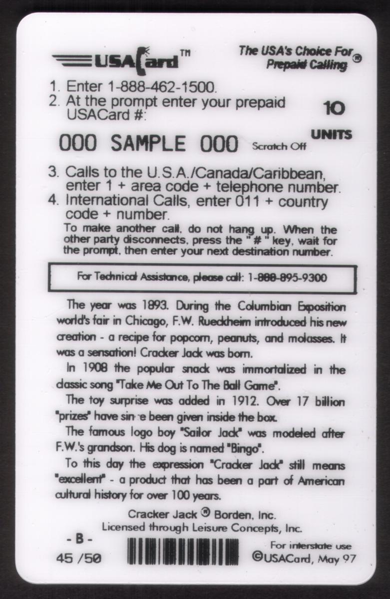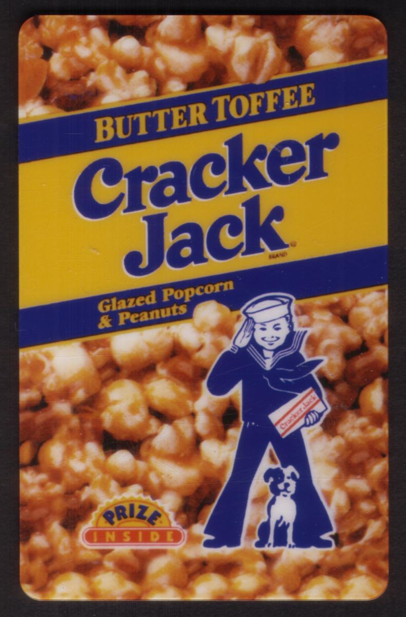 The card’s design directly connects to Americana themes such as snacks, foods, and nostalgic branding. Included keywords mention "Promotionals, snacks, foods, Americana, popcorn, peanuts, sweets, dogs, animals, sailor jack, bingo, f w rueckheim, prize inside," which correspond with the visual elements on the card. The card is identified as a sample by USACard Corporation and ties to the Cracker Jack brand’s long history of snack promotion.