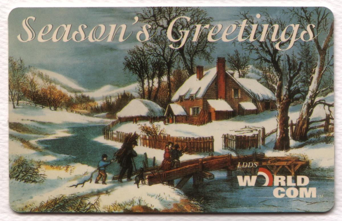 The card captures the essence of the holiday season with a serene atmosphere. The colors are cool with predominately white snow and hints of brown and green from the natural elements. The text on the card prominently includes "10u Season's Greetings 1996 Winter Scene," and the name WorldCom appears clearly, indicating the issuing company. The design emphasizes themes of Christmas and family celebration during winter.