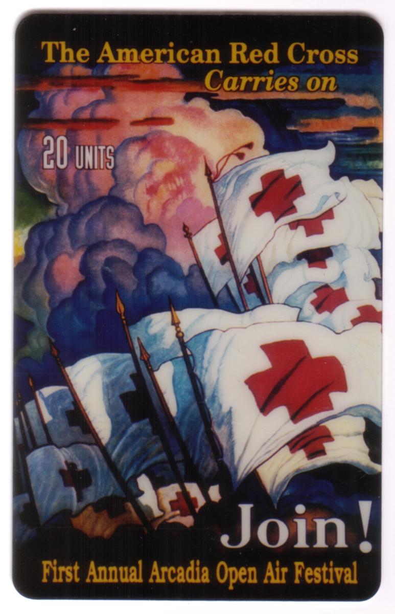 This collectible phone card commemorates the American Red Cross First Annual Arcadia Open Air Festival held in Arcadia, California. The design features a vivid reproduction of the 1933 recruitment poster by artist N.C. Wyeth prominently displayed at the center. The poster illustrates a determined figure dressed in period attire, symbolizing the call to support the American Red Cross. Surrounding this central image, the card includes text referencing non-profits, the phrase "join the American National Red Cross carries on," and the event location of Arcadia, California.