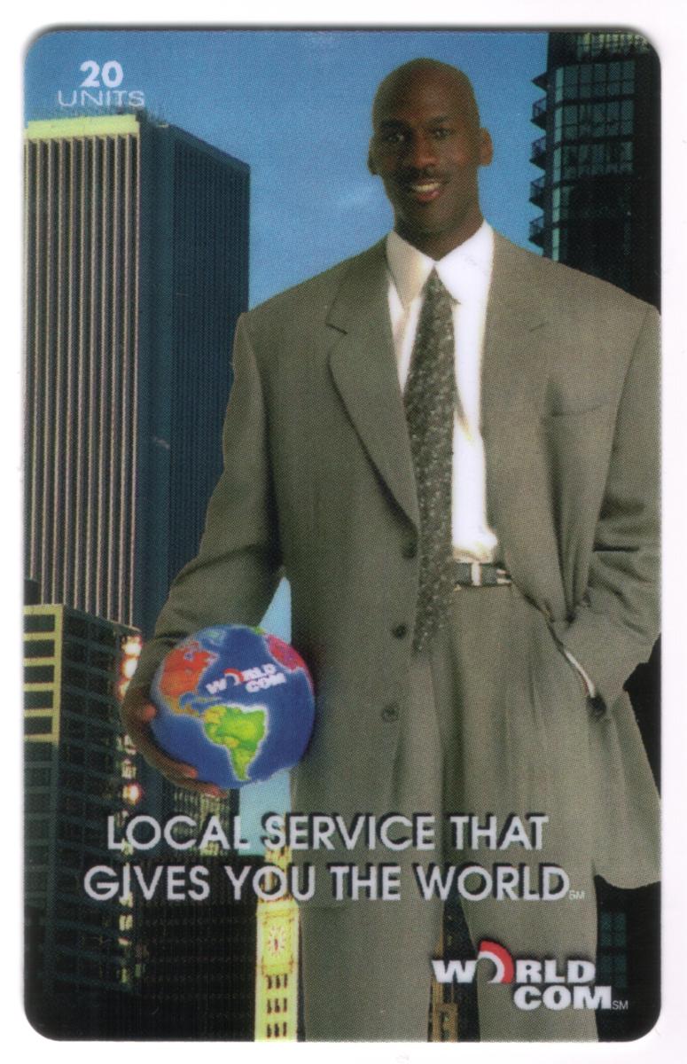 This card dates from 1998 and represents a connection to basketball, highlighting Michael Jordan, a famous NBA player, alongside promotional messaging related to global communication service. The overall presentation blends sports celebrity endorsement with corporate branding and the concept of worldwide connectivity.