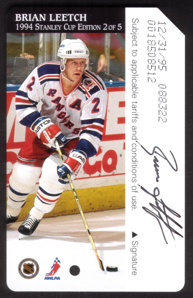 At the bottom of the card, there are official logos for the NHL and NHLPA. The right side of the card prominently displays Brian Leetch’s printed signature along with the date “12/1/95” and a sequence code. The overall design highlights the connection to New York City’s transportation system while commemorating the Rangers’ 1994 Stanley Cup championship and Brian Leetch’s important role in the team.