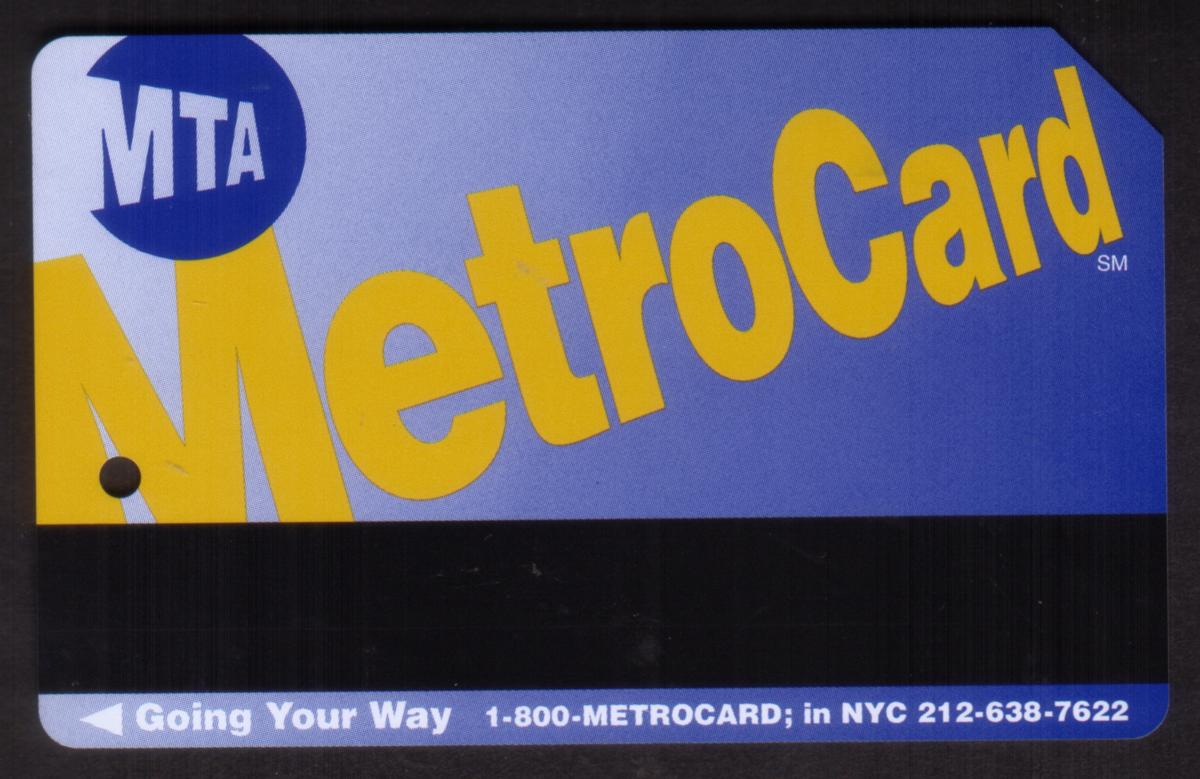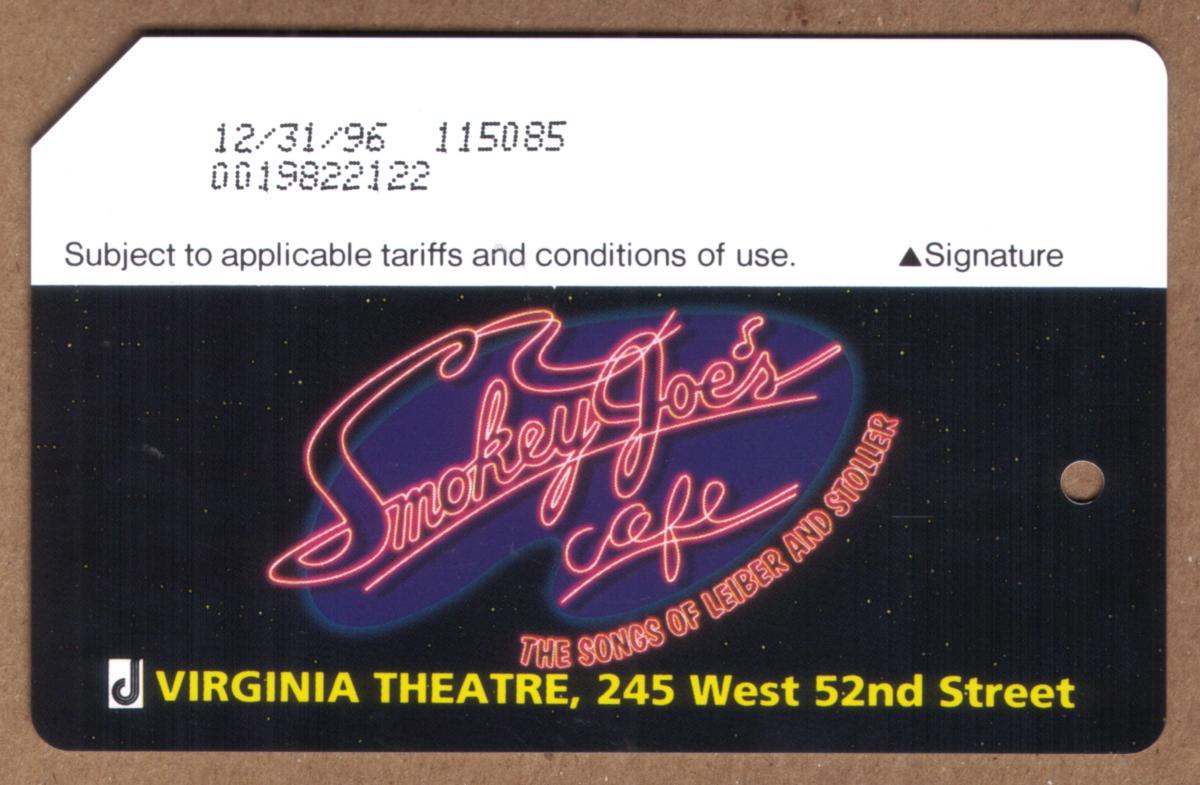 This card highlights New York City’s subway system and transit culture through the MTA MetroCard format, combined with a theatrical theme tied to the Virginia Theatre and the musical "Smokey Joe's Cafe."