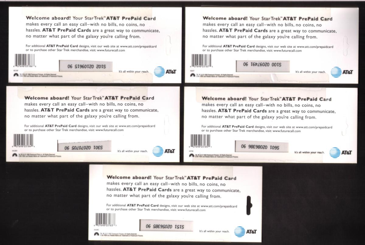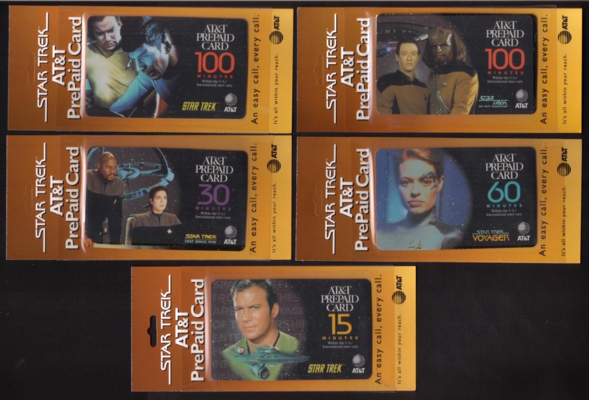 This set of five Star Trek AT&T PrePaid Cards features collectible calling cards with images from the various Star Trek television series. Each card is marked with a prepaid value of 15, 30, 60, or 100 minutes and is branded with AT&T and Star Trek logos on a yellow-orange background stripe on the right.