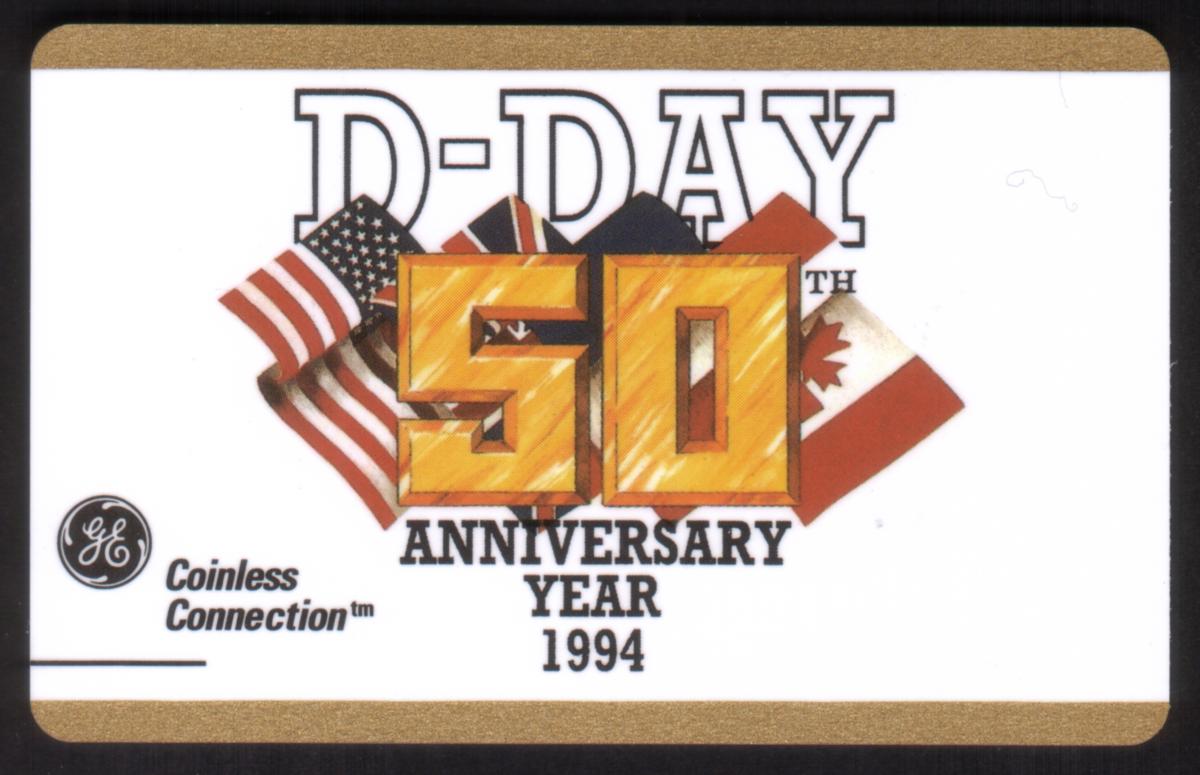 This collectible phone card commemorates the 50th anniversary of D-Day in 1994. The card prominently features the text "D-DAY 50th ANNIVERSARY YEAR 1994" in bold lettering. Behind the number "50," there are four national flags arranged side by side: the United States, the United Kingdom, France, and Canada. The GE Coinless Connection logo appears on the lower left corner of the card.