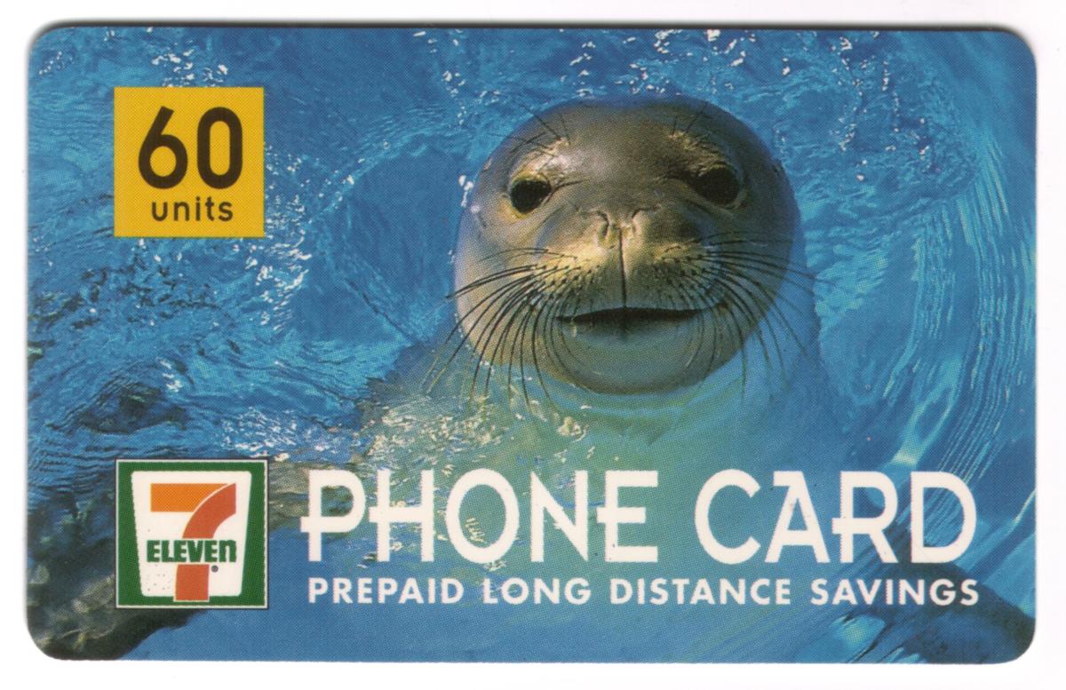 The overall design of the card emphasizes marine life through the striking photographic representation of the sea lion, specifically the endangered Hawaiian monk seal, making this card a collectible item associated with both 7-Eleven and WorldCom in a Hawaiian-themed series.