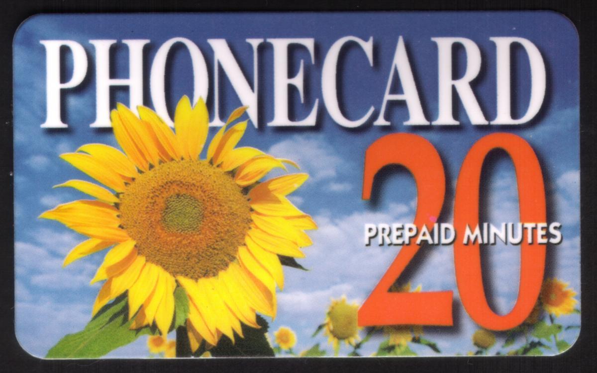 The third card features a close-up of a bright yellow sunflower against a vivid blue sky dotted with clouds. Additional sunflowers appear smaller in the background, creating a sunny and uplifting natural scene. This card also states “PHONECARD” and “20 PREPAID MINUTES” in matching bold white and orange lettering.