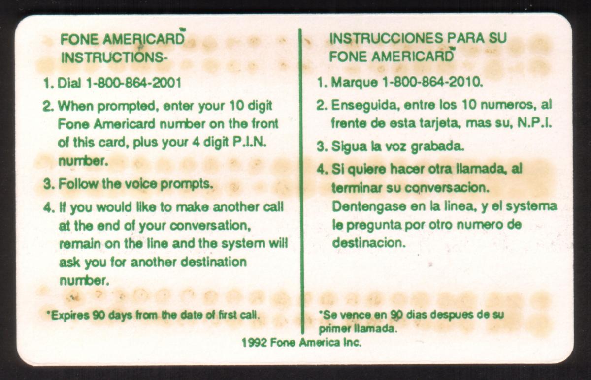 This Fone Americard is a paper phone card from 1992 with bilingual English and Spanish usage implied by the keywords. It serves as a collectible item related to telecommunications from that era.