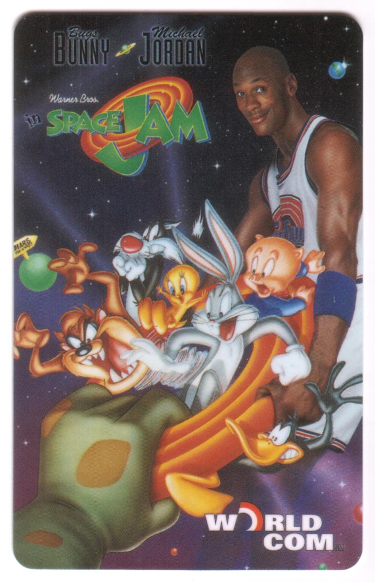 At the top of the card, the text reads "Bugs Bunny" and "Michael Jordan," with the official "Space Jam" logo displayed prominently in the center. The Warner Bros. branding is subtly integrated above the logo. At the bottom right corner of the card, the "WorldCom" company logo appears in white and orange, indicating the issuer of this card.