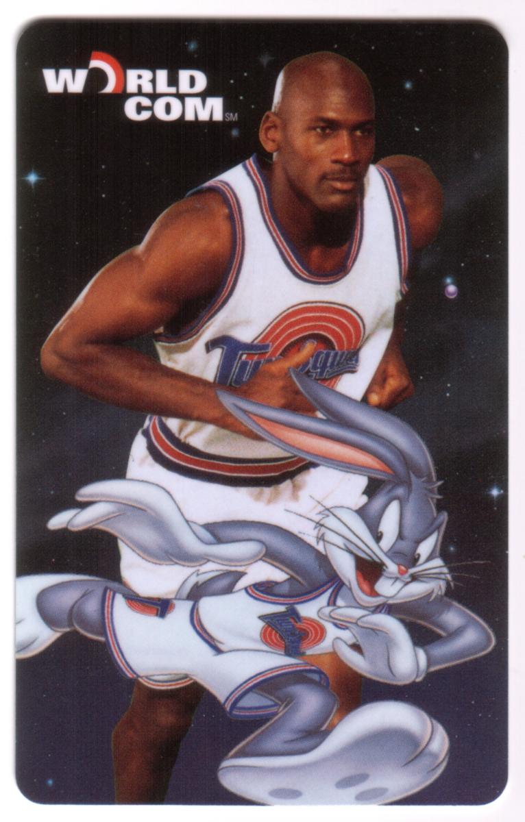 The card displays the WorldCom logo in the top left corner, indicating the telecommunications company associated with the phone card. Both characters are central to the card’s design, highlighting the popular collaboration between Michael Jordan and the Looney Tunes characters that defined the Space Jam film, combining sports and animation in a memorable way.