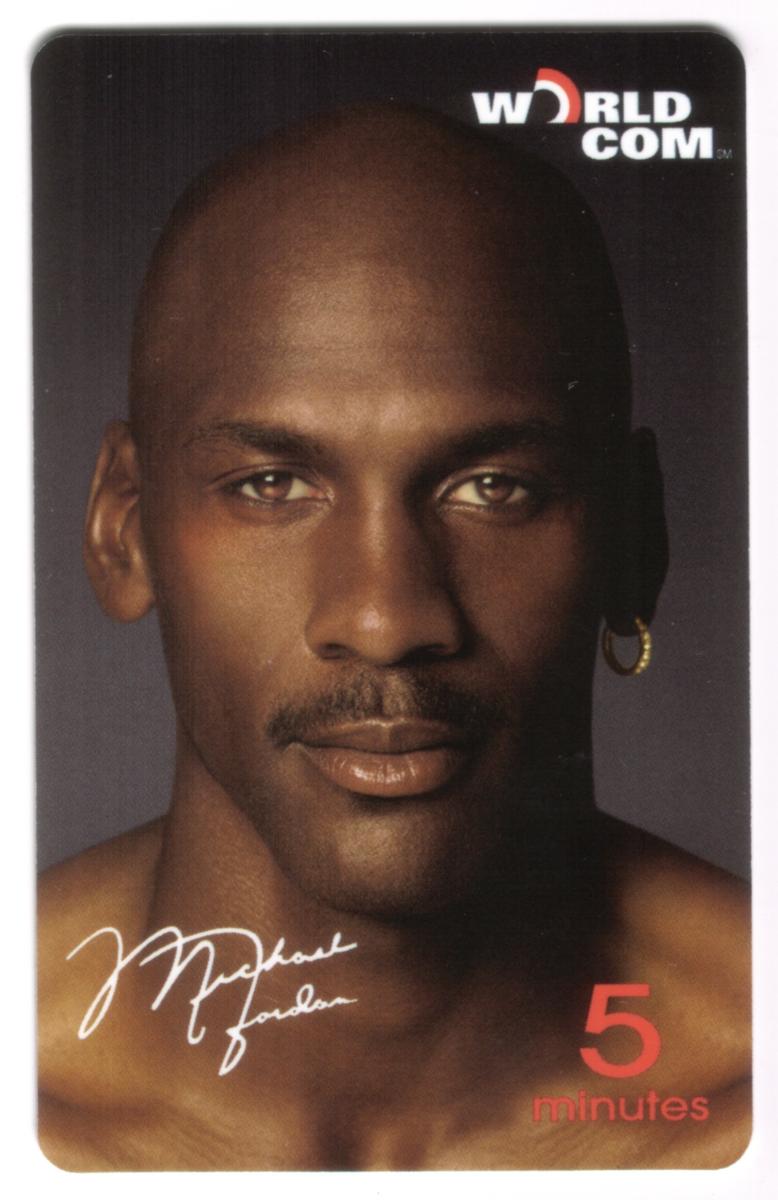 At the top right corner, the card displays the WorldCom logo in white and red. The bottom right corner shows the card's value as "5 minutes" in red text. The design is clean and focused entirely on Michael Jordan's face, making it a striking and recognizable collectible item related to the NBA and basketball.