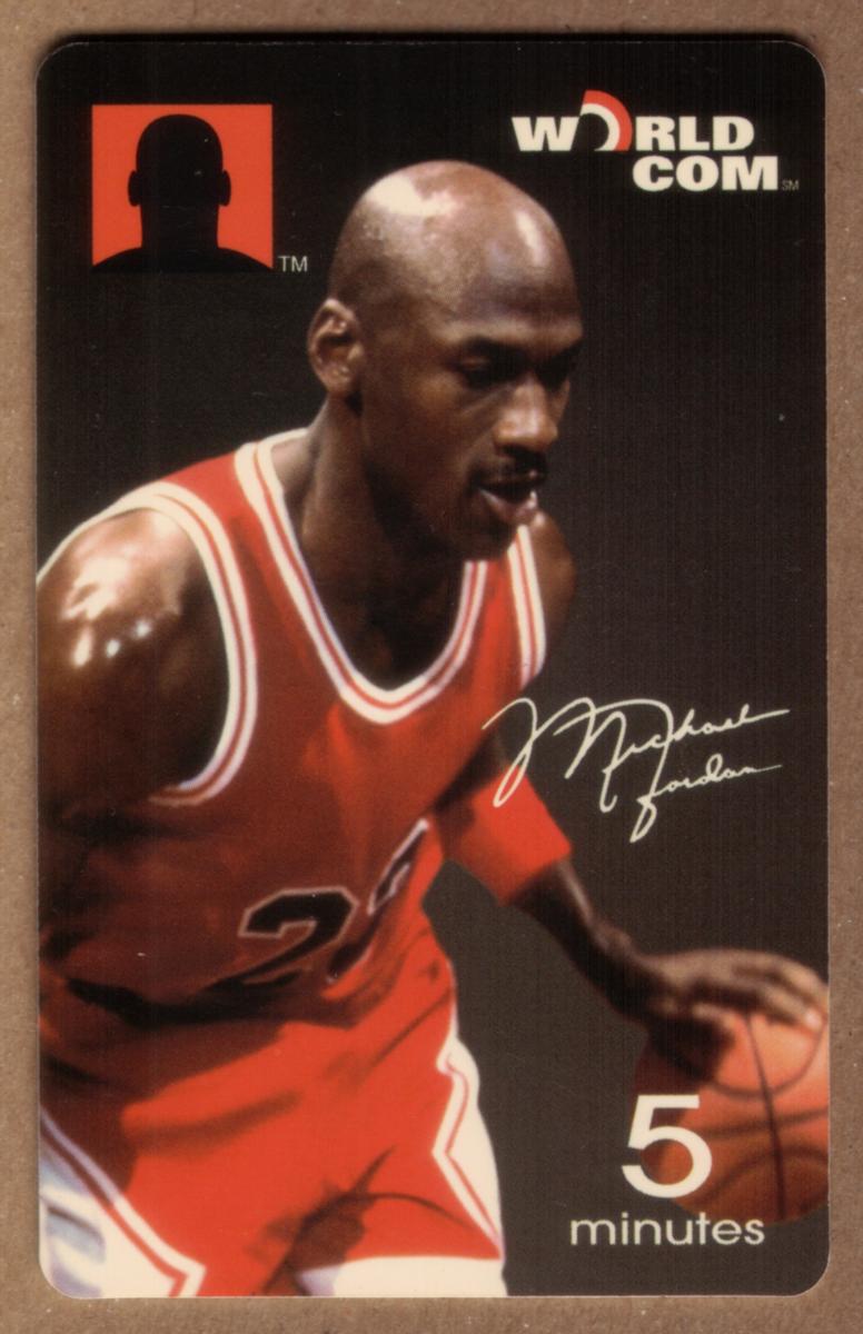 This promotional phone card is associated with NBA basketball and highlights Michael Jordan as a famous basketball player and celebrity. The overall design emphasizes Jordan moving forward aggressively with the basketball, symbolizing his skill and determination on the court.