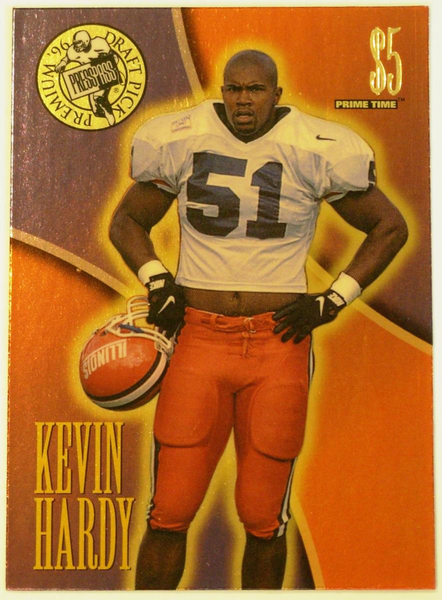 This is a $5 card associated with football sports collectibles. The visual presentation highlights Kevin Hardy’s role as a draft pick from 1996, with the team colors incorporated through the card’s design elements and the player’s uniform. The card combines sports imagery and branding for a collectible purpose.