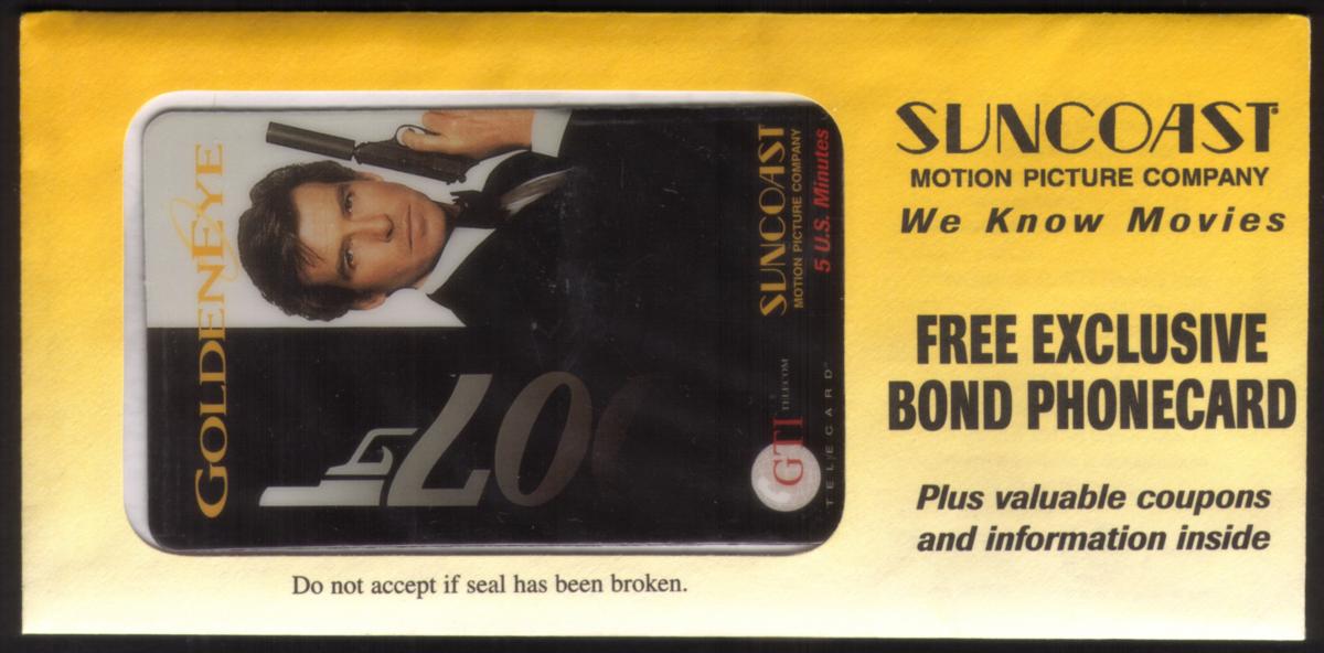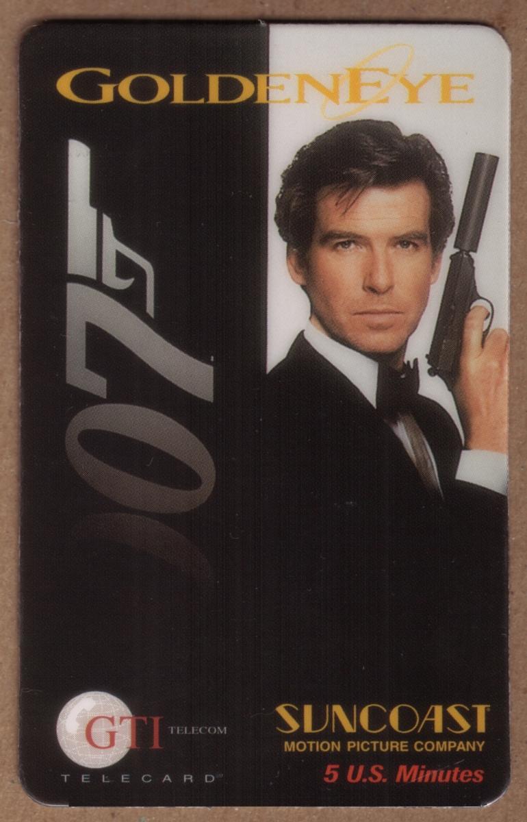This card is issued by GTI Telecom, Inc., and promotes the 1995 James Bond motion picture "GoldenEye," featuring Pierce Brosnan as the iconic British spy. It is designed to connect with fans of the film and collectors interested in Hollywood movie memorabilia and entertainment icons.