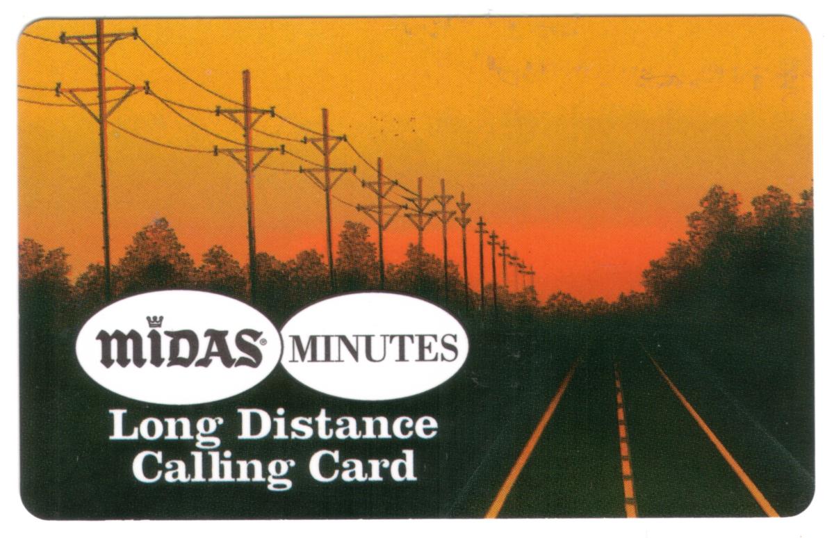 The card displays the text "Midas Minutes" in white oval shapes near the lower left corner, with "mIDAS" in a stylized font and "MINUTES" in a simpler font. Beneath this, the text "Long Distance Calling Card" appears in white, clearly indicating the card’s use for long distance telephone calls. The overall design combines the theme of roads and power lines with the branding of Midas Minutes.